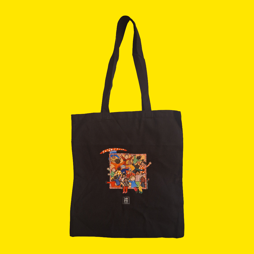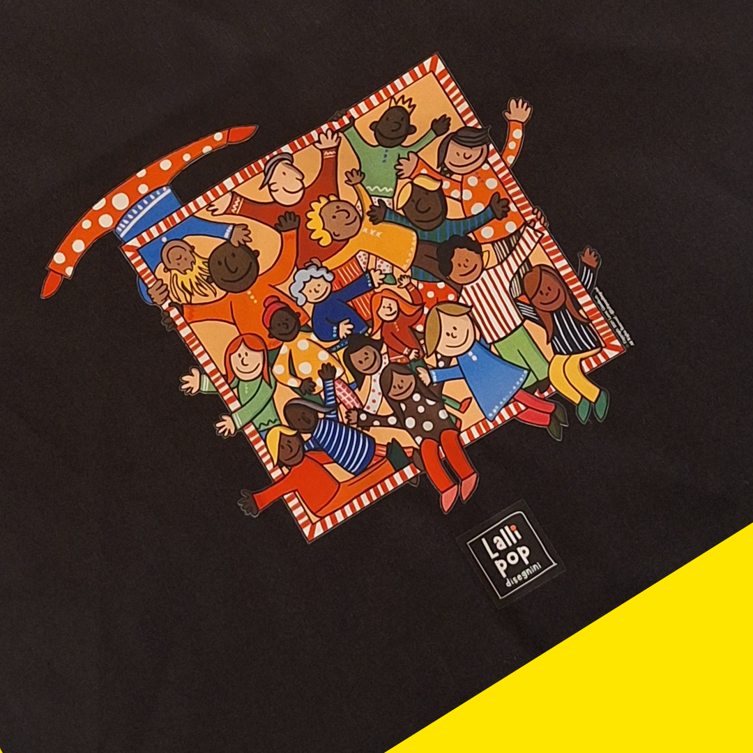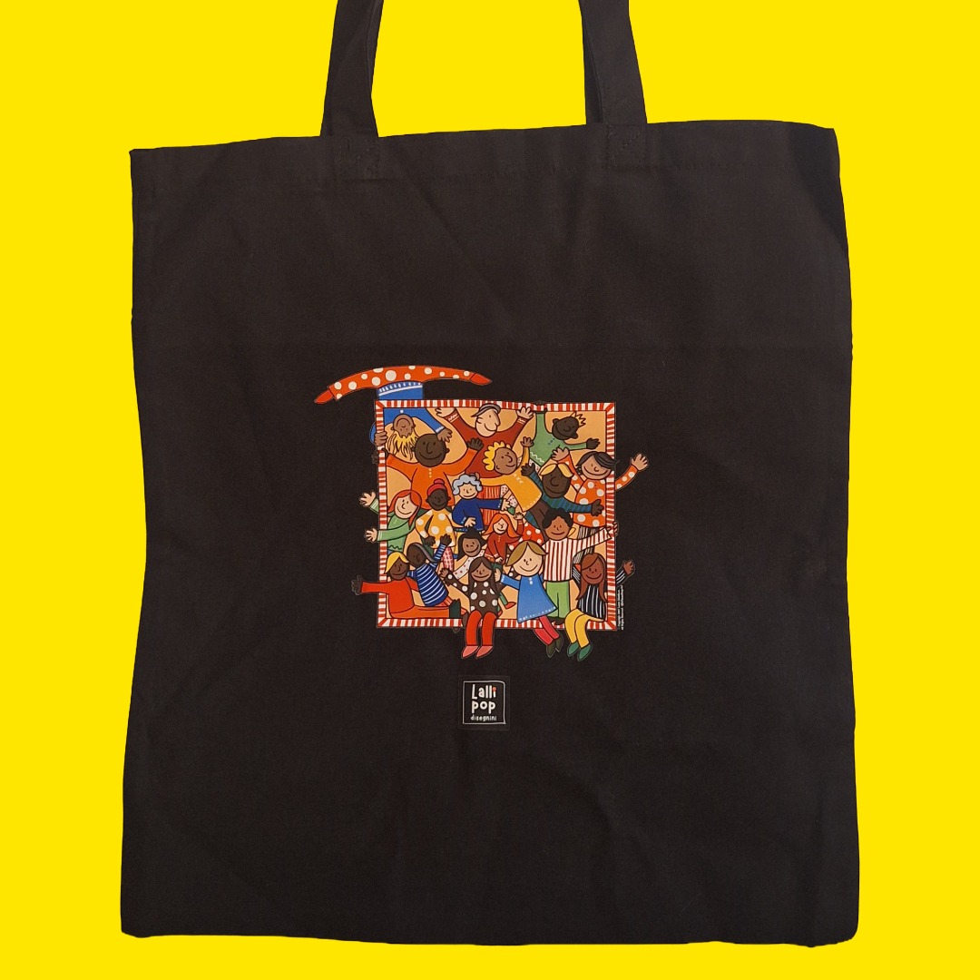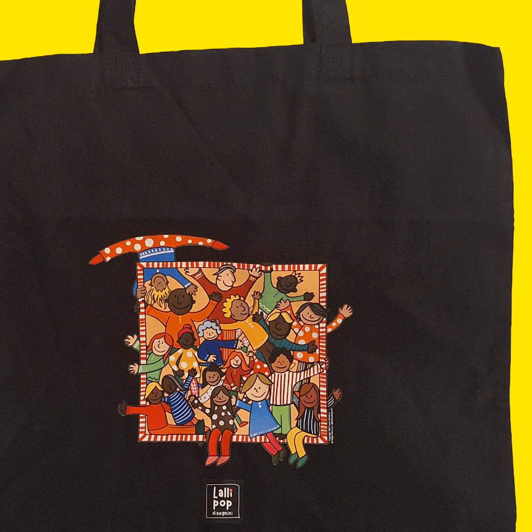 Shopper in colore nero con stampa in DTF dell'illustrazione "C'è posto per tutti" copyright laura Giordano - Lallipop disegnini.